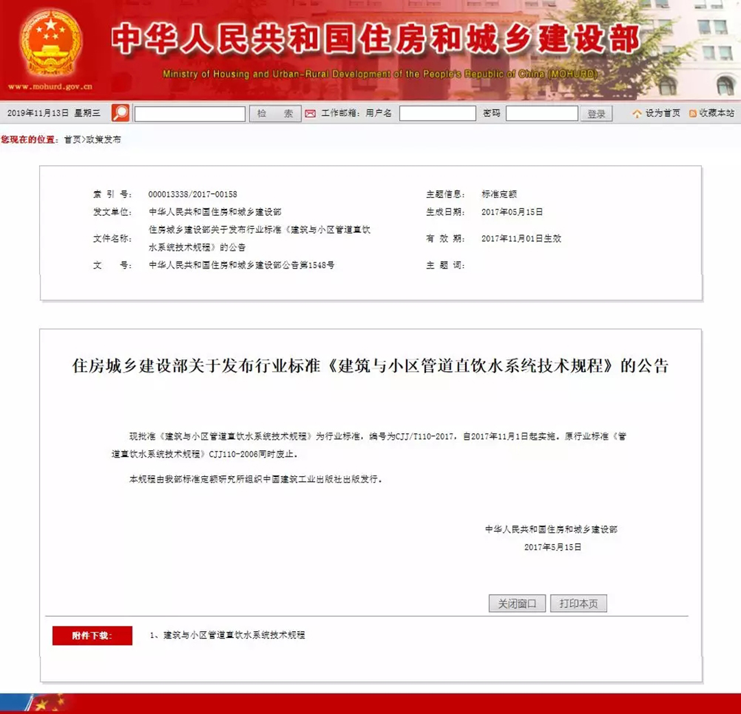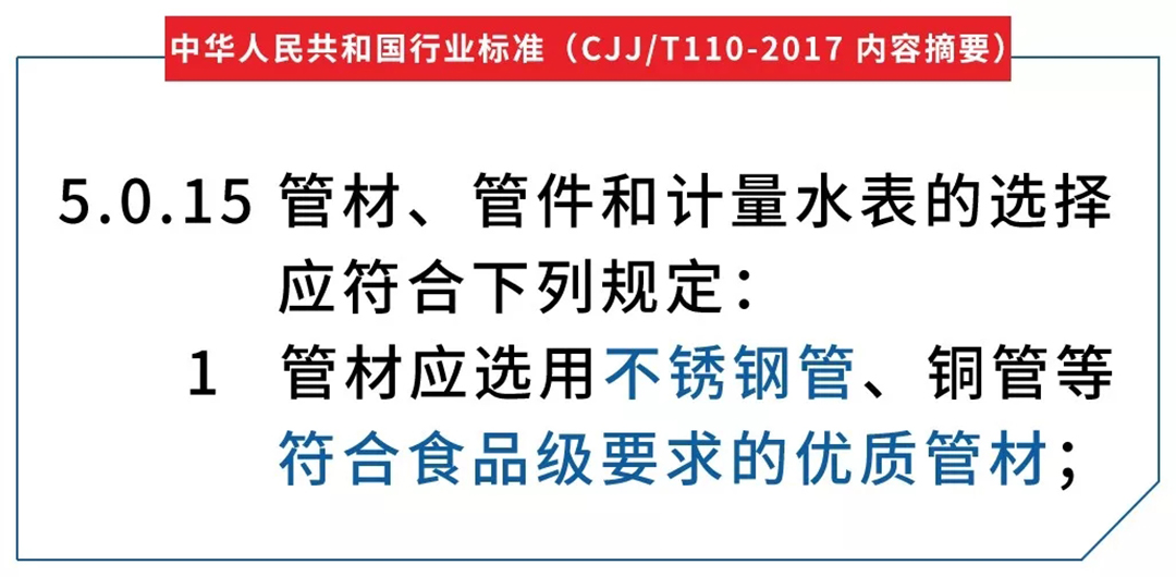 2017年5月15日中華人民共和國住房和城鄉(xiāng)建設(shè)部批準(zhǔn)發(fā)布《建筑與小區(qū)管道直飲水系統(tǒng)技術(shù)規(guī)程》為行業(yè)標(biāo)準(zhǔn),編號為CJJ/T110-2017,自2017年11月1日起實施。規(guī)程修訂主要內(nèi)容包含取消塑料管的相關(guān)規(guī)定及管材應(yīng)選用不銹鋼管、銅管等符合食品級要求的優(yōu)質(zhì)管材。
