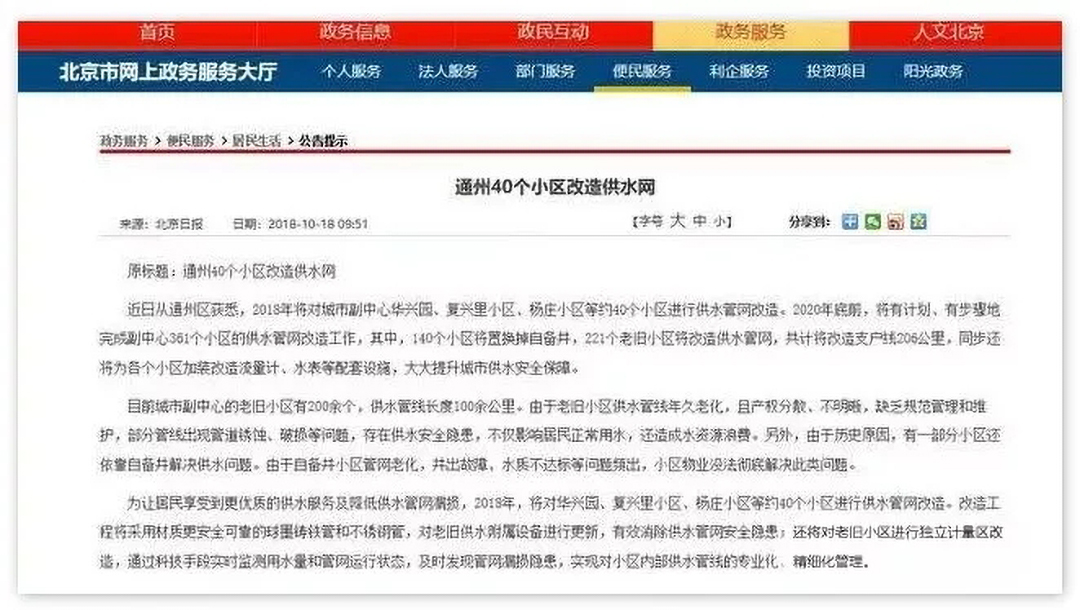 2018年北京將對城市副中心的華興園、復(fù)興里小區(qū)、楊莊小區(qū)等約40個小區(qū)進行供水管網(wǎng)改造。2020年底前,將有計劃、有步驟地完成361個小區(qū)的供水管網(wǎng)改造工作,大大提升城市供水安全保障度。