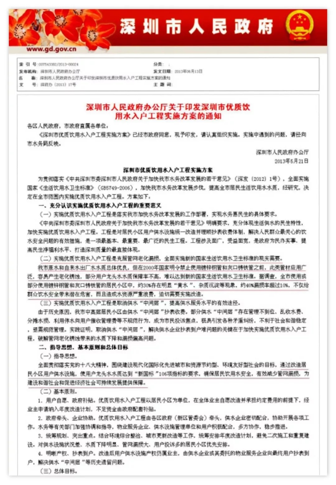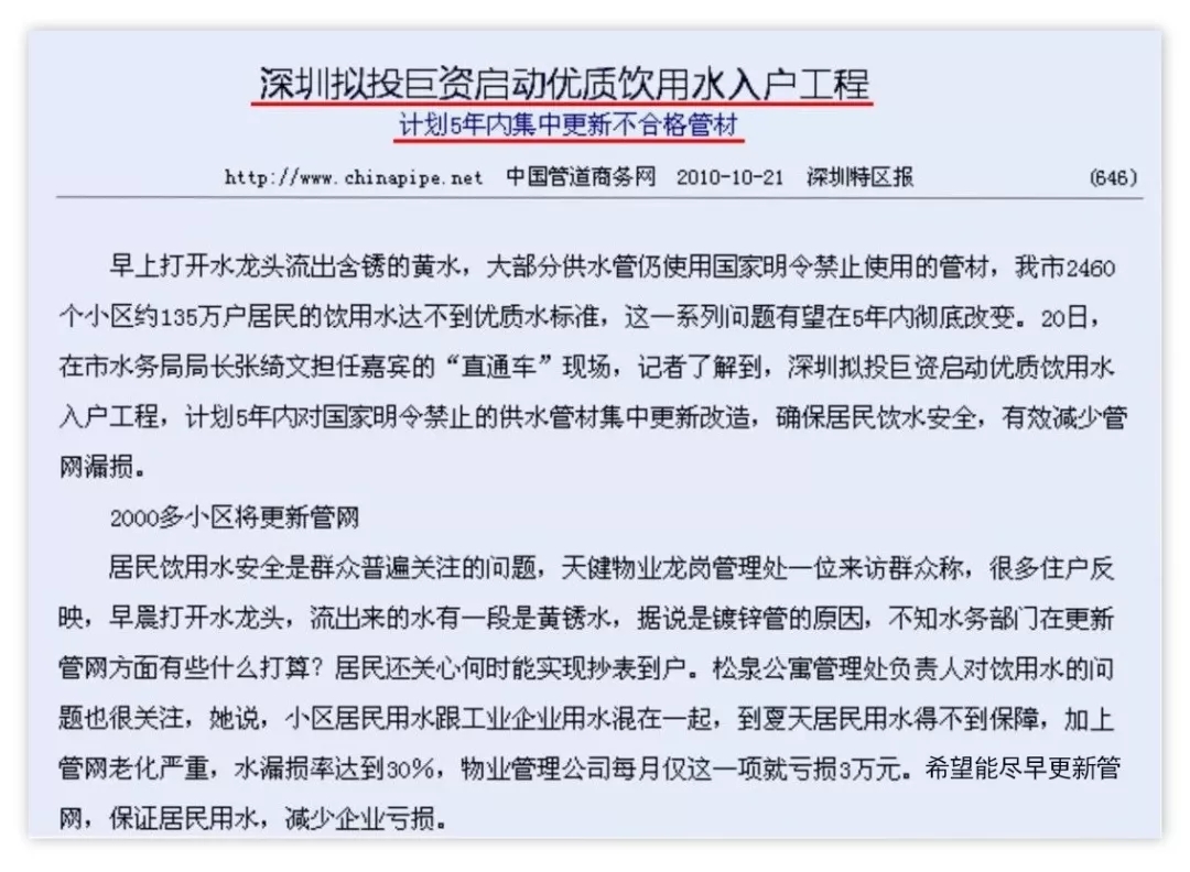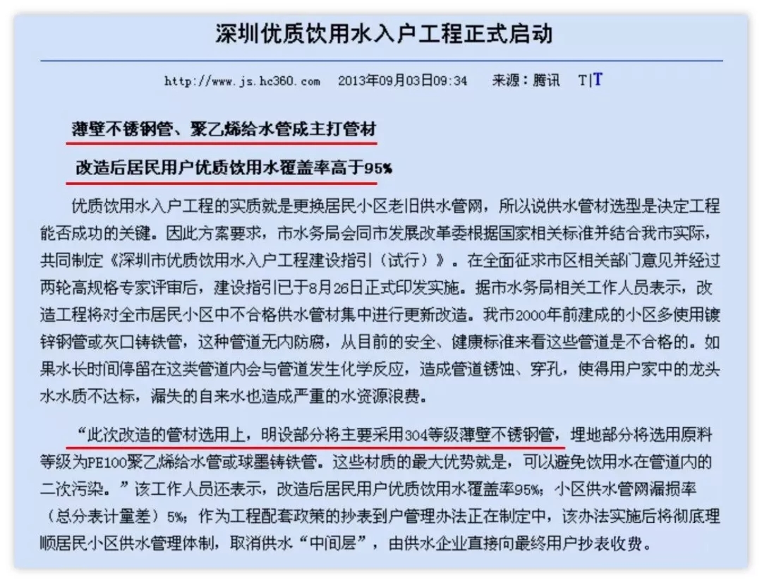 2015年10月19日深圳市水務(wù)局下達《深圳市水務(wù)局征求加大優(yōu)質(zhì)飲用入戶改造工程第一階段投資力度意見的函》(深水函[2015]1338號)文件,逐步將生活飲用水地下管網(wǎng)更換為不銹鋼管。