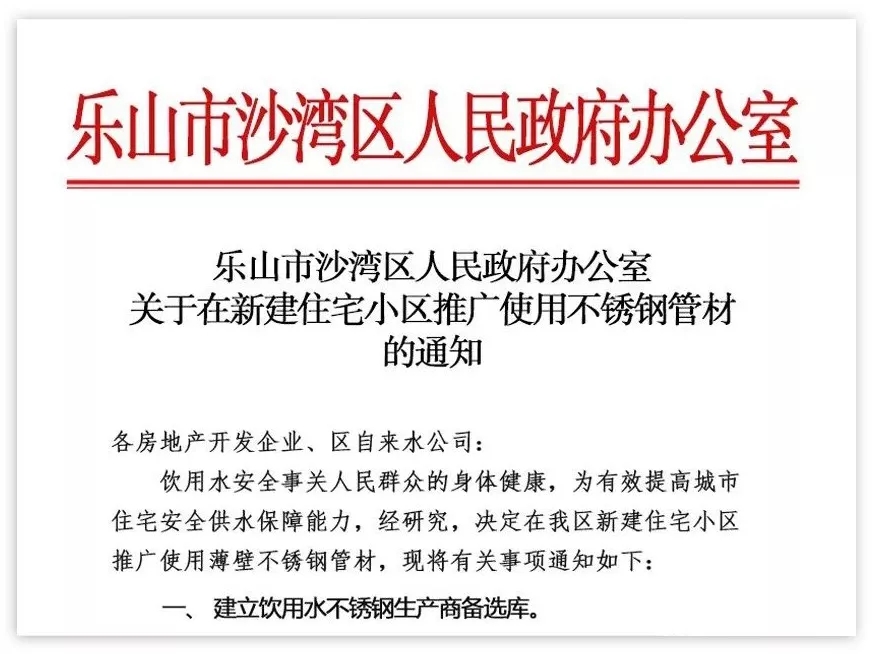 樂山市沙灣區(qū)人民政府辦公室發(fā)布《關(guān)于在新建住宅小區(qū)推廣使用不銹鋼管材的通知》,從發(fā)文之日起實施。沙灣區(qū)從而成為繼深圳市、長沙市、海門市之后的第四個推廣使用不銹鋼水管的地方政府,也是全國第二個推廣使用不銹鋼水管的縣級區(qū)域。